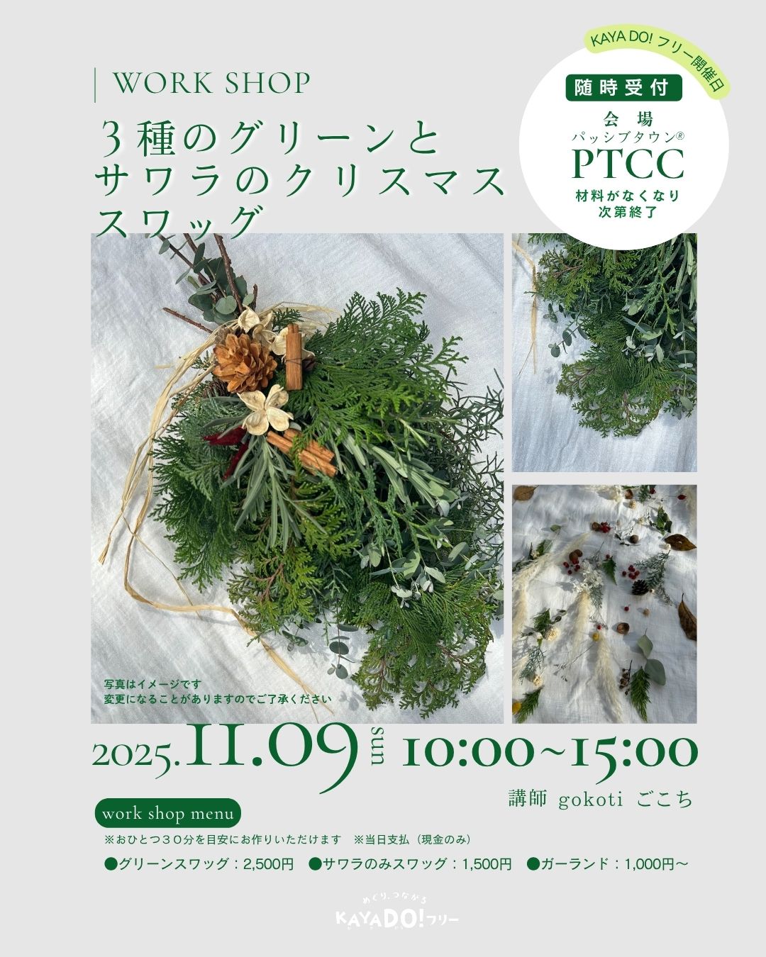 参加費:グリーンスワッグ2,500円、サワラのみスワッグ1,500円、ガーランド1,000円~